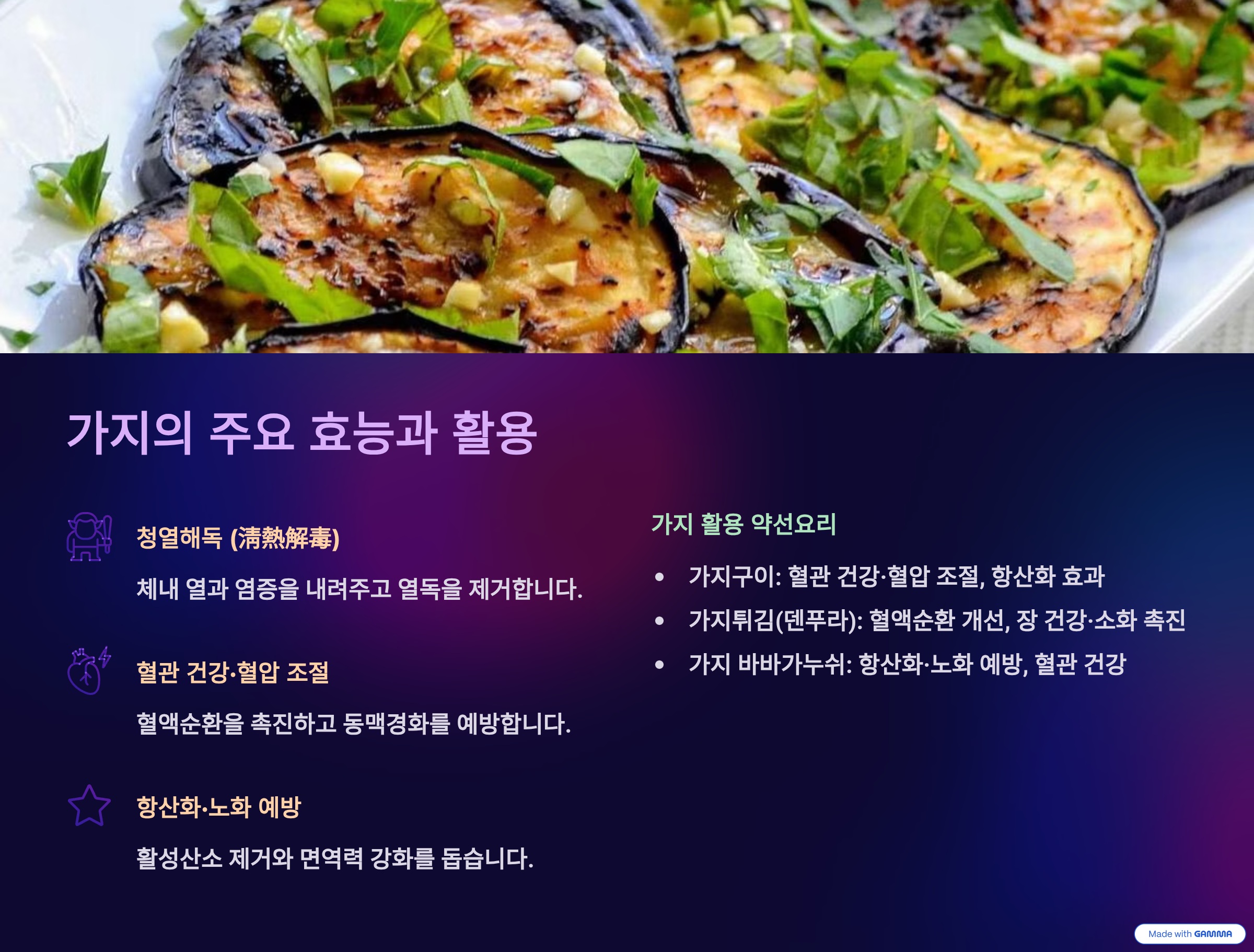 ✨ 가지(茄子)는 청열해독, 지혈, 항산화, 장 건강에 도움을 주는 다재다능한 약재이자 채소입니다. 🌿